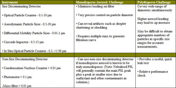 表1中。概述之間的權(quán)衡氣溶膠的產(chǎn)生和過濾器測試儀表選型。