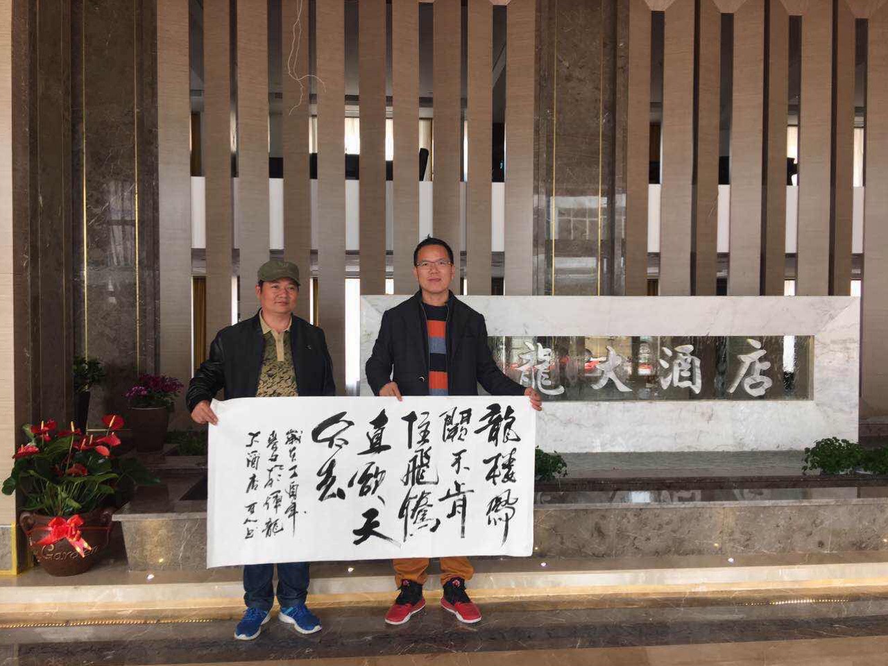董事長與書法展作品在大廳的合影