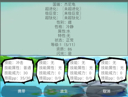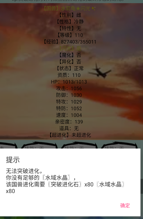 進(jìn)化資質(zhì)變成了水箭龜,資質(zhì)達(dá)到110(110-98=12),繼續(xù)查看是否還能進(jìn)化,然后繼續(xù)升級(jí)繼續(xù)進(jìn)化