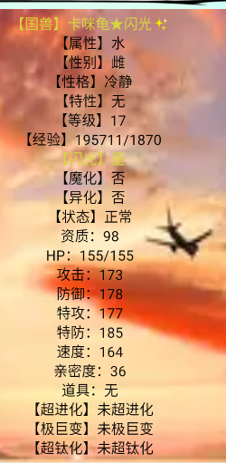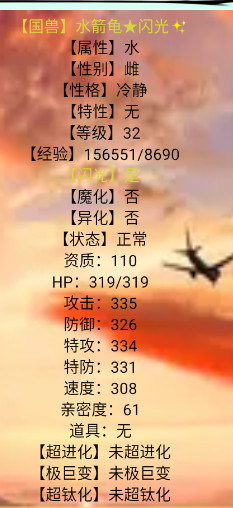 可以在國(guó)獸庫里面看到它的資質(zhì)達(dá)到86(86-61=25),閃光給我們加成了25點(diǎn)
