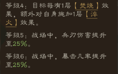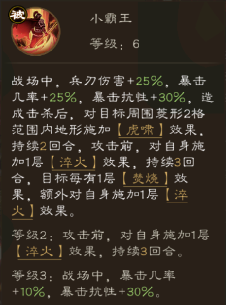 ? 天賦描述:戰(zhàn)場(chǎng)中,兵刃傷害+25%,暴擊幾率+25%,暴擊抗性+30%,造成擊殺后,對(duì)目標(biāo)周圍菱形2格范圍內(nèi)地形施加【虎嘯】效果,持續(xù)2回合,攻擊前,對(duì)自身施加1層【淬火】效果,持續(xù)3回合,目標(biāo)每有1層【焚燒】效果,額外對(duì)自身施加1層【淬火】。