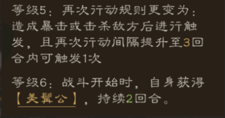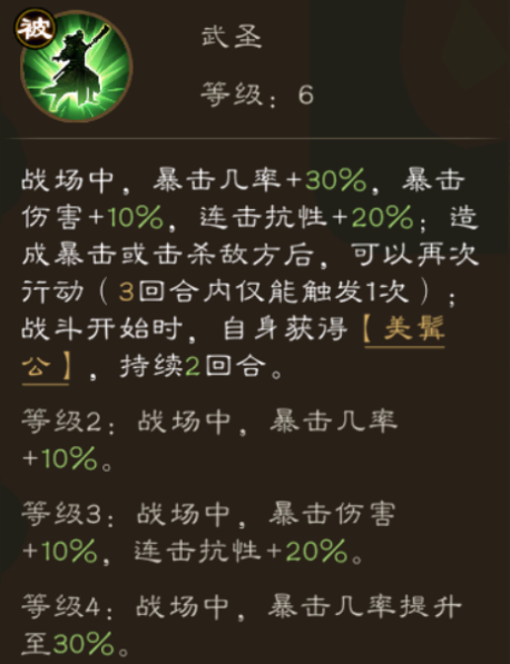 ? 天賦描述:戰(zhàn)場(chǎng)中,暴擊幾率+30%,暴擊傷害+10%,連擊抗性+20%;造成暴擊或擊殺敵方后,可以再次行動(dòng)(3回合內(nèi)僅能觸發(fā)1次);戰(zhàn)斗開始時(shí),自身獲得【美髯公】,持續(xù)2回合。
