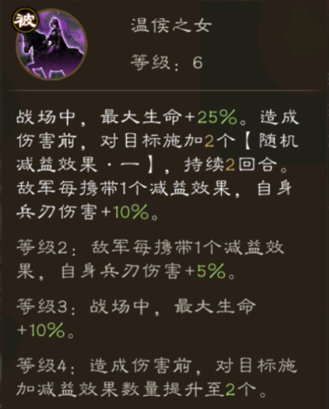 ? 天賦描述:戰(zhàn)場(chǎng)中,最大生命+25%。造成傷害前,對(duì)目標(biāo)施加2個(gè)【隨機(jī)減益效果·一】,持續(xù)2回合。敵軍每攜帶1個(gè)減益效果,自身兵刃傷害+10%。