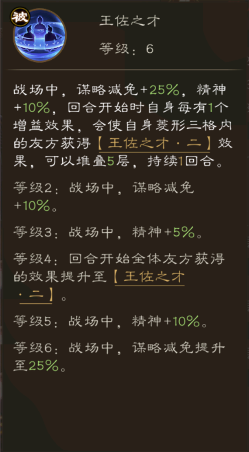 ? 天賦描述:戰(zhàn)場(chǎng)中,謀略減免+25%,精神+10,回合開始時(shí)自身每有1個(gè)增益效果,會(huì)使自身菱形三格內(nèi)的友方獲得【王佐之才·二】效果,可以堆疊5層,持續(xù)1回合。