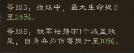 兵刃與謀略增傷+4%,兵刃與謀略減傷+4%。