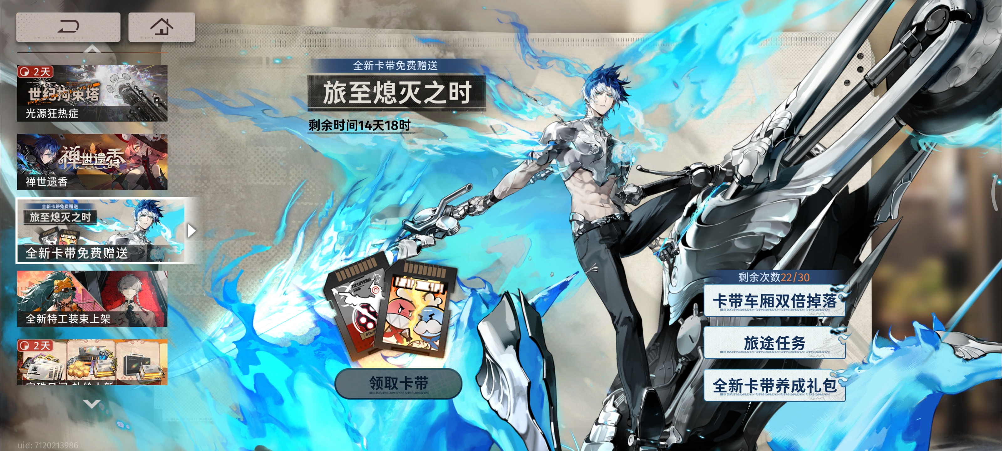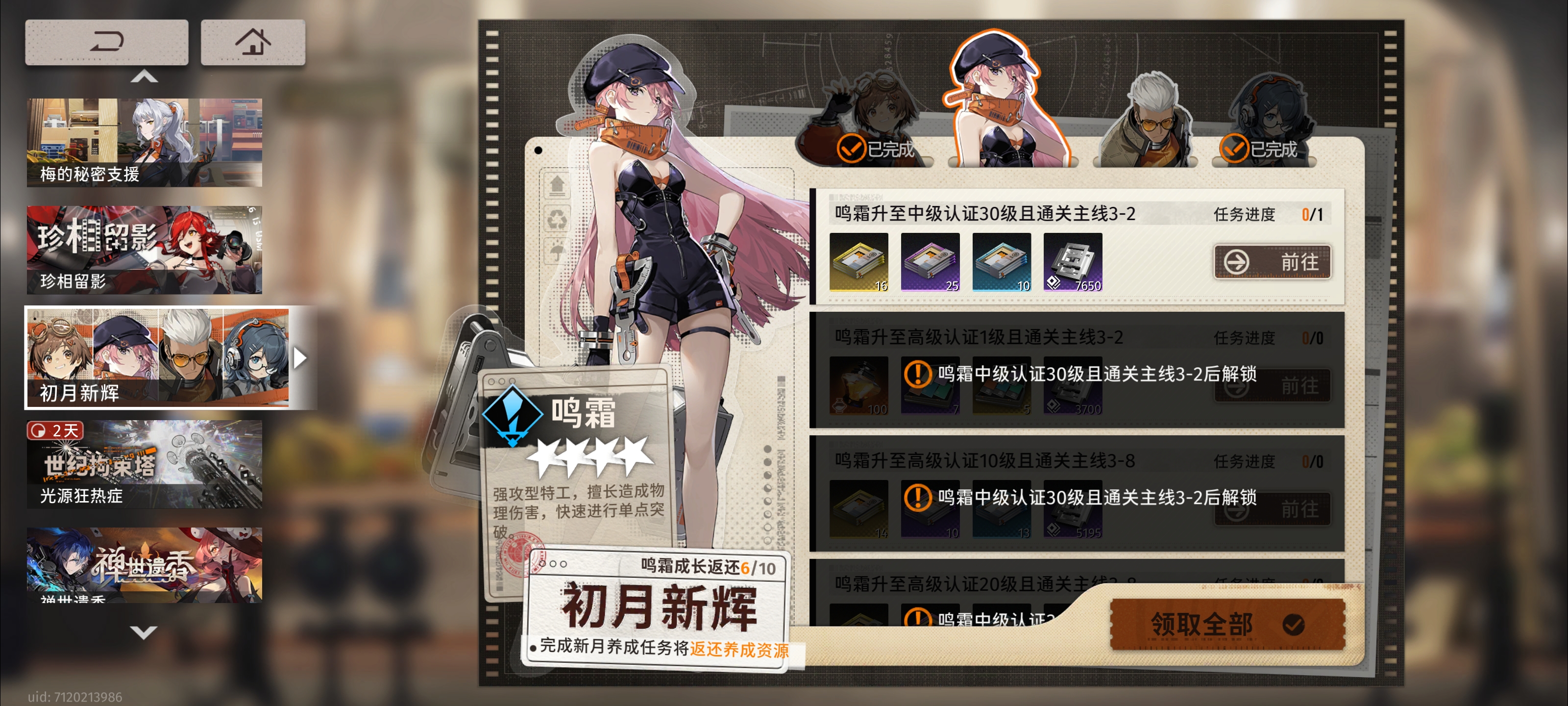 在拉了突破等級(jí),以及技能等級(jí)之后可以把活動(dòng)里的卡帶(相當(dāng)于圣遺物,遺器之類(lèi)的)領(lǐng)了,注意是二選一,選第一套輸出的,配合上面活動(dòng)里的材料和旅途任務(wù),可以拉到30級(jí),給你當(dāng)前隊(duì)伍的主c使用