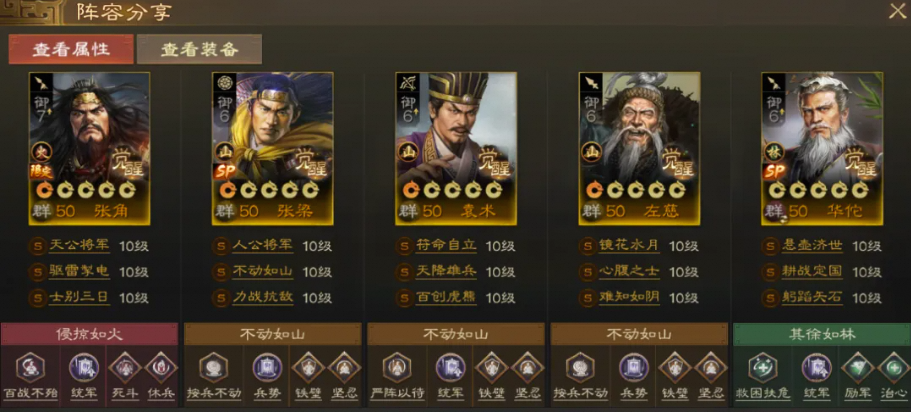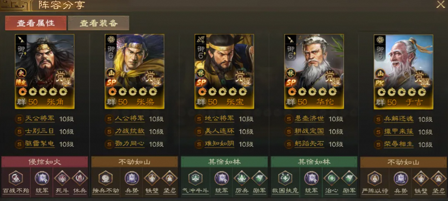 以黃巾羈絆為基礎(chǔ)組建的隊(duì)伍,加上群雄兩個(gè)防御最強(qiáng)掛件SP華佗和于吉。SP張角和張梁均有一定的輸出,SP張寶輔助SP張角打出更爆炸的傷害,SP華佗和于吉保證隊(duì)伍很難減員,攻守兼?zhèn)涞年?duì)伍。這里的SP華佗是可以換普通華佗的,沒(méi)有于吉可以考慮上左慈,或者上袁術(shù)帶召喚戰(zhàn)法。