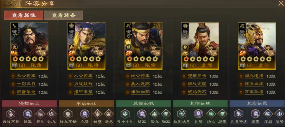 隊(duì)伍輸出以召喚兵+SP張角輸出為主,通過(guò)一堆召喚兵提高SP張角疊【黃天】的效率,讓SP張角每回合都能高層數(shù)放自帶戰(zhàn)法。同時(shí)多個(gè)召喚兵對(duì)SP張梁帶【不動(dòng)如山】也有收益,很容易疊滿4層,讓SP張梁免傷突破100%,更輕松分?jǐn)傟?duì)友傷害。