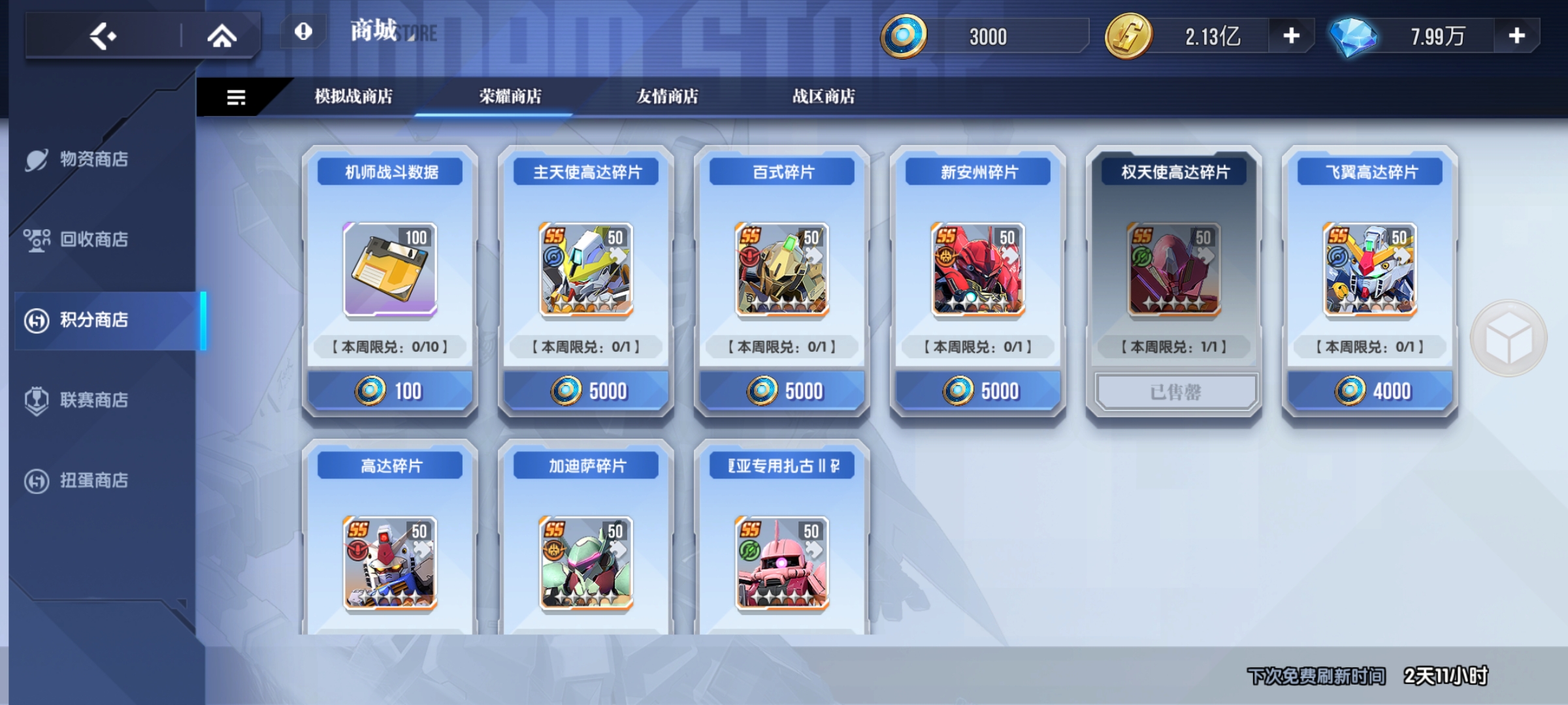 模擬戰(zhàn)每周穩(wěn)定獲得42000幣,前期把s高達(dá)買夠5個(gè)以后,多的幣買超級(jí)卷,機(jī)師養(yǎng)成材料,1000和1500的10個(gè)碎片,2500的光暗碎片只能開狗糧,缺狗糧可以買。除了s高達(dá),不推薦買3萬的ss,性價(jià)比太低。