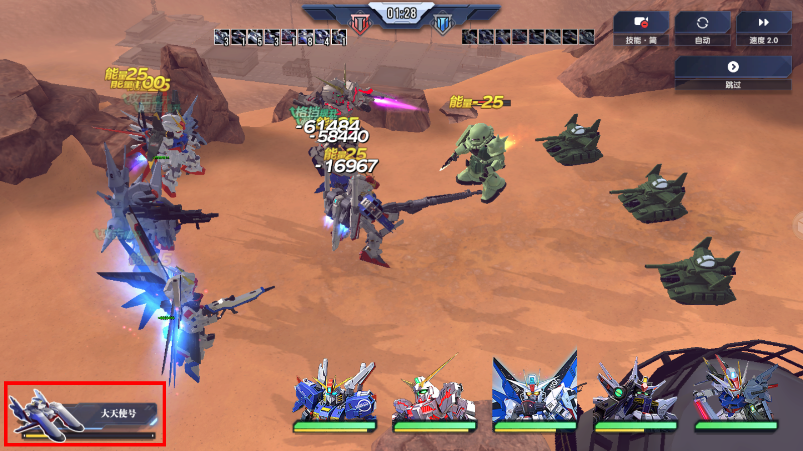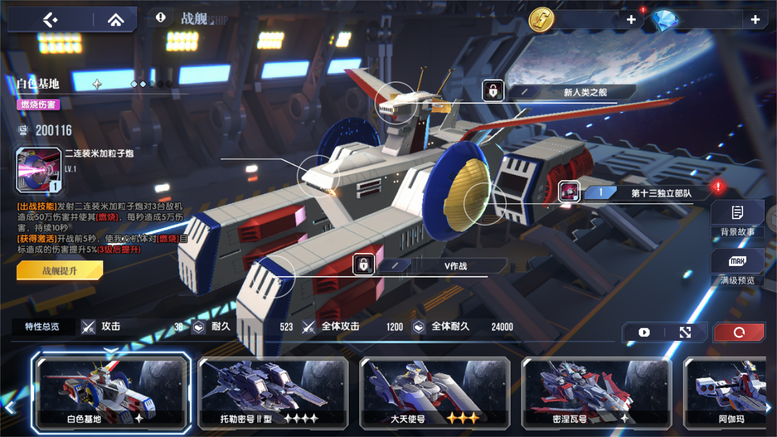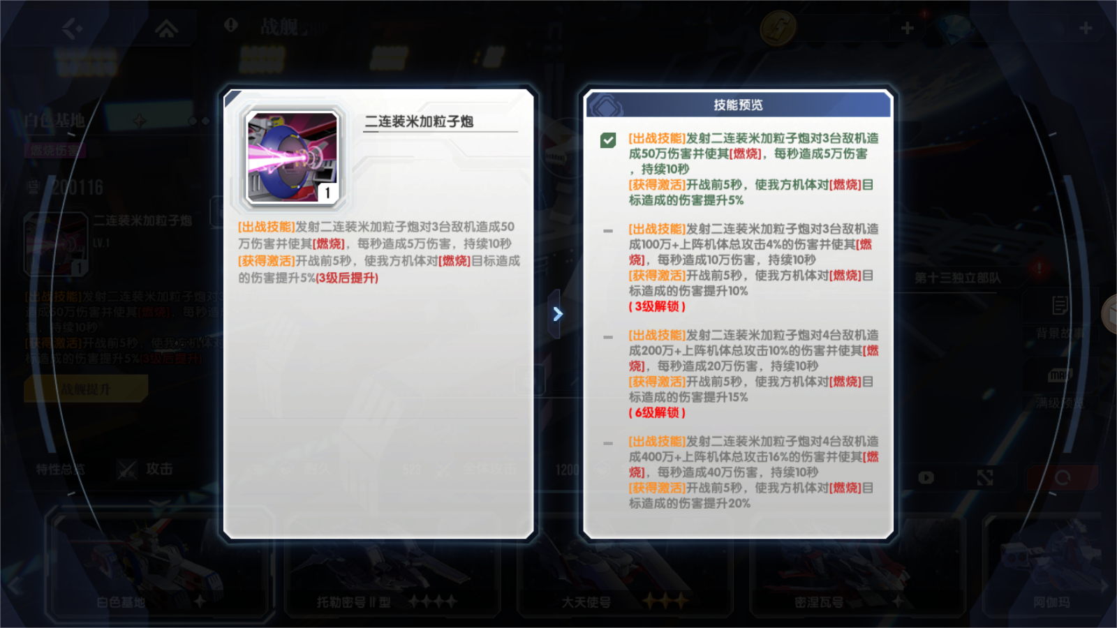 以1星的戰(zhàn)艦【白色基地】為例,它的出戰(zhàn)技能可以在戰(zhàn)斗中對(duì)3臺(tái)敵機(jī)造成500000點(diǎn)傷害并使目標(biāo)陷入【燃燒】狀態(tài),每秒造成50000點(diǎn)傷害,持續(xù)10秒。