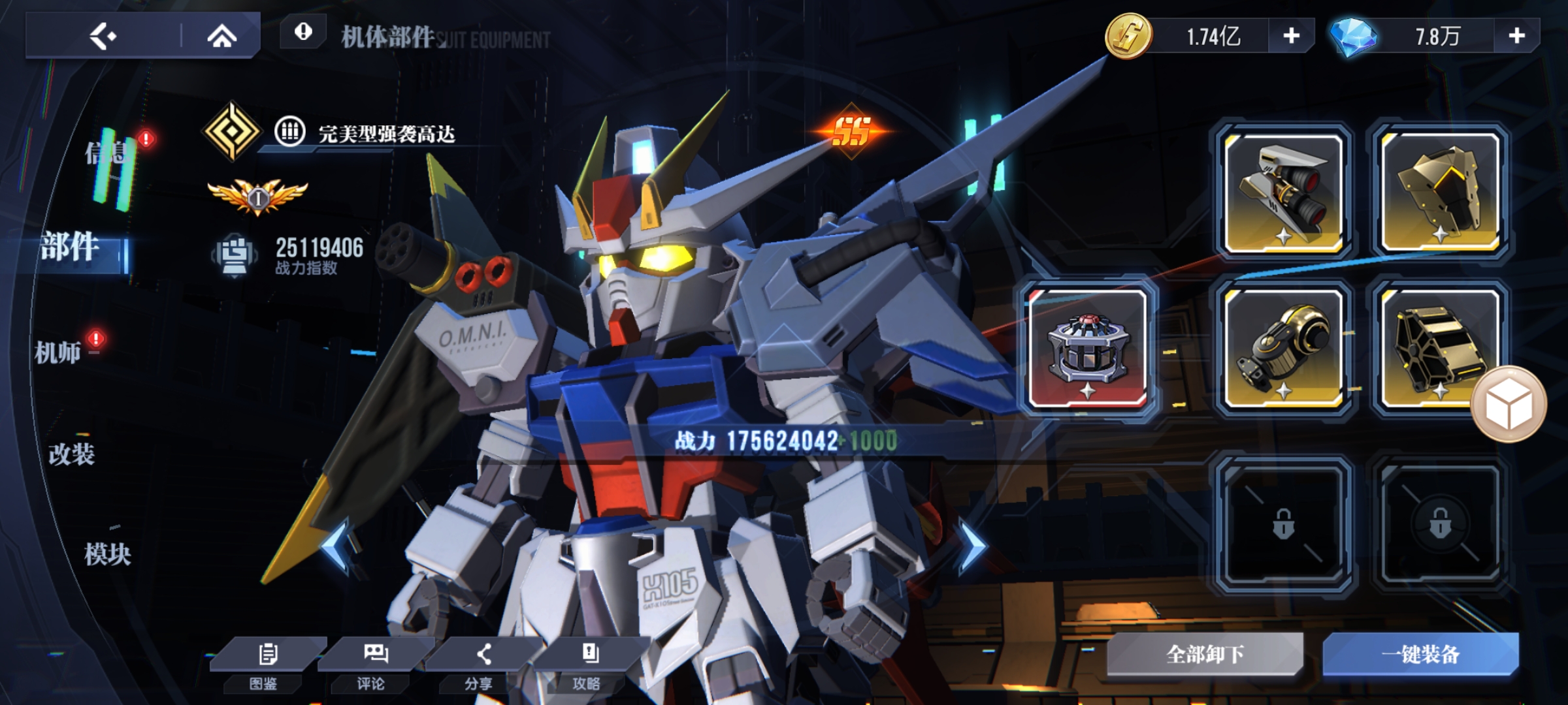 ? ? 再看下面兩張圖,先說普通部件,最好帶成套的,因?yàn)榧拥陌俜直葘傩院芏?,?zhàn)力加的很多。再說特殊部件,第一張圖帶的加攻擊75000的紅色特殊部件,第二張圖帶的反應(yīng)爐(25技能傷害率25能量),只有特殊部件不一樣,上圖比下圖多160萬戰(zhàn)力。