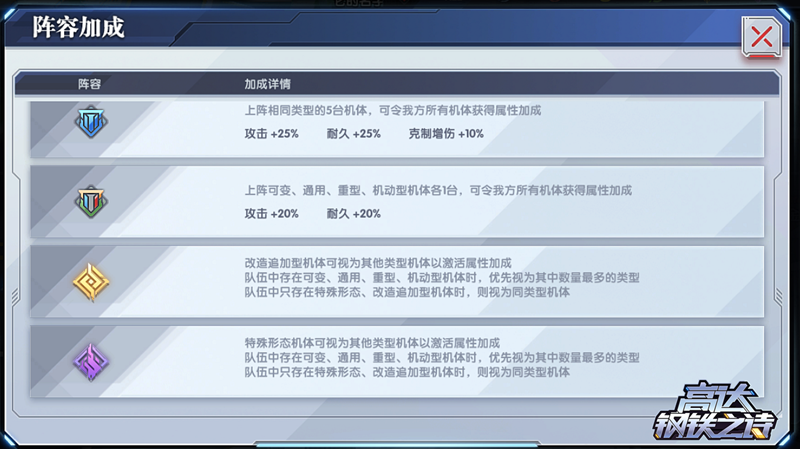 ? ? 除了克制關(guān)系外,機(jī)體類型還會(huì)影響我們?cè)诰庩?duì)時(shí)獲得的陣容加成。上陣3臺(tái)、4臺(tái)、5臺(tái)同類型機(jī)體時(shí),所有機(jī)體將分別獲得攻擊和耐久的加成;上陣4臺(tái)及以上同類型機(jī)體時(shí),還可以獲得額外的5%和10%克制增傷。