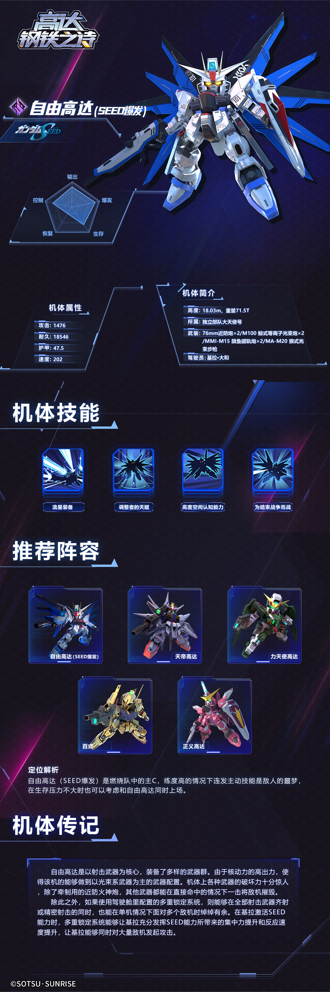 自由高達(dá)(SEED爆發(fā))是一臺SP屬性的突擊機(jī)體,繼承了自由高達(dá)的強(qiáng)大爆發(fā)力。激活其【高度空間認(rèn)知能力】后,它不僅能展現(xiàn)出驚人的戰(zhàn)斗力,還能降低敵方的能量,擾亂對方的節(jié)奏。