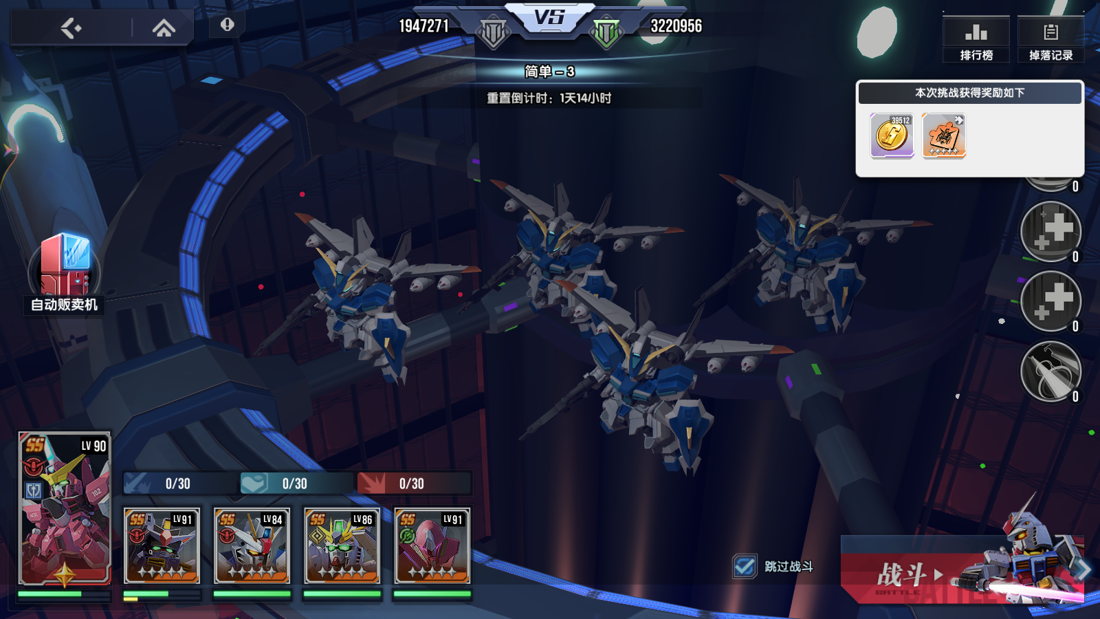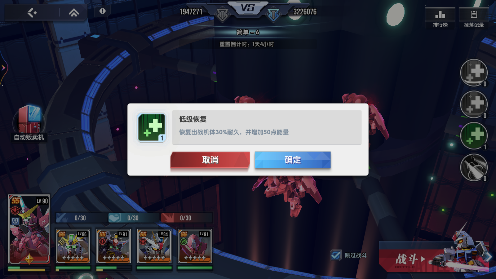 ? ? ?軌道電梯每次開啟持續(xù)48小時(shí),之后重置并再次開啟。指揮官可選擇1~5臺機(jī)體出戰(zhàn),確認(rèn)后本次挑戰(zhàn)的機(jī)體無法更改。每次戰(zhàn)斗僅可選擇一臺機(jī)體出戰(zhàn),已陣亡機(jī)體無法再次出戰(zhàn),當(dāng)所有機(jī)體陣亡時(shí),本次挑戰(zhàn)結(jié)束。每次戰(zhàn)斗結(jié)束后,我方機(jī)體和敵方機(jī)體的耐久和能量都會保存。
