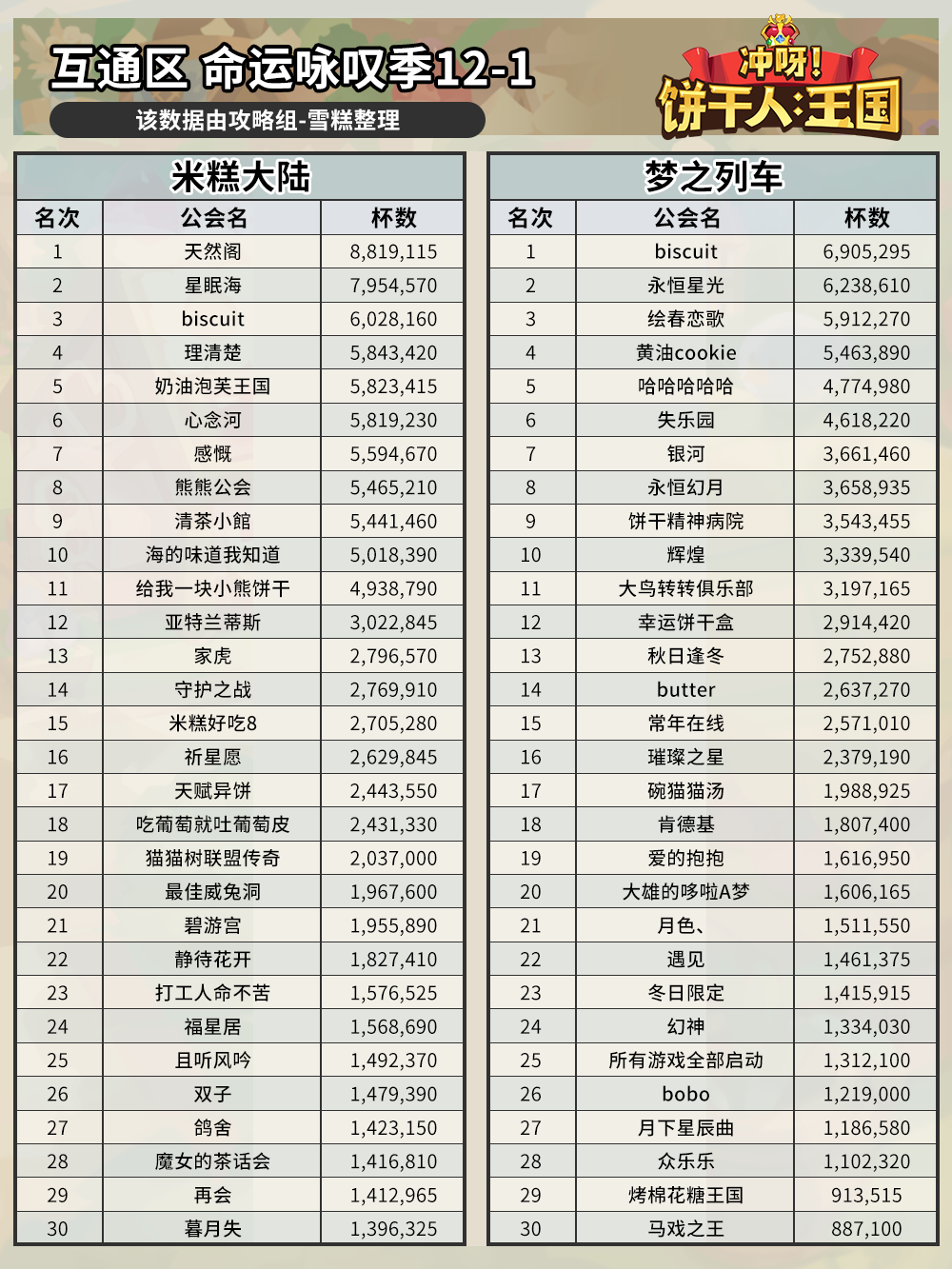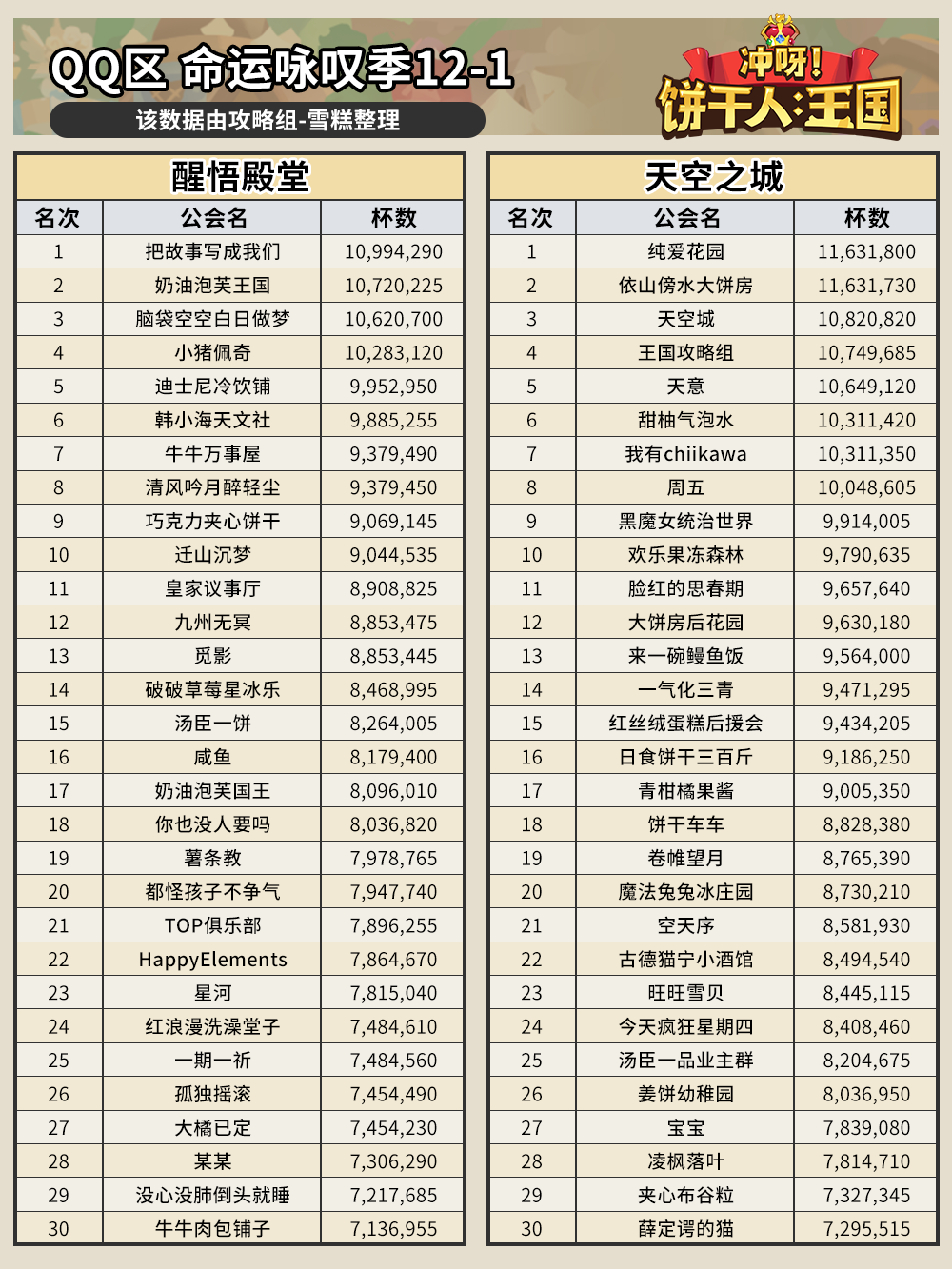 呀!餅干人:王國(guó)命運(yùn)詠嘆季12-1公會(huì)排名如下: