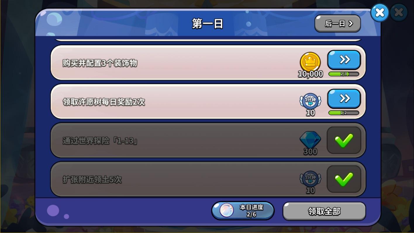 日任務(wù)不同,完成任務(wù)即可領(lǐng)取好禮。首日我們可以輕松通關(guān)1-13領(lǐng)取300個水晶。