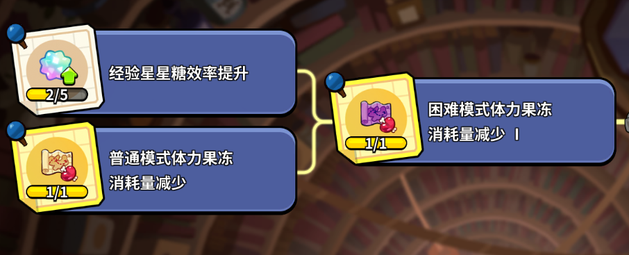 然后多種餅干攻擊力、防御力加成都點到1級,一直解鎖路線,直到所有餅干暴擊傷害增加的位置。一般新手玩家還沒有那么快拉到暴擊傷害,所以在前期也可以優(yōu)先升滿前三欄:經驗星星糖效率增加、一般模式體力果凍消耗量減少、暗黑模式體力果凍減少消耗量。
