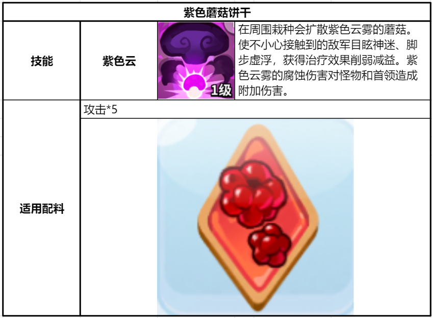 紫蘑菇餅干是一個(gè)技能可以造成大范圍的持續(xù)傷害,同時(shí)能產(chǎn)生減療效果的餅干,傷害高,范圍廣,不管是PVP還是PVE都非常適用。而且,因?yàn)槟芴峁┤后w減療,所以是非常適合PVP競(jìng)技場(chǎng)的。