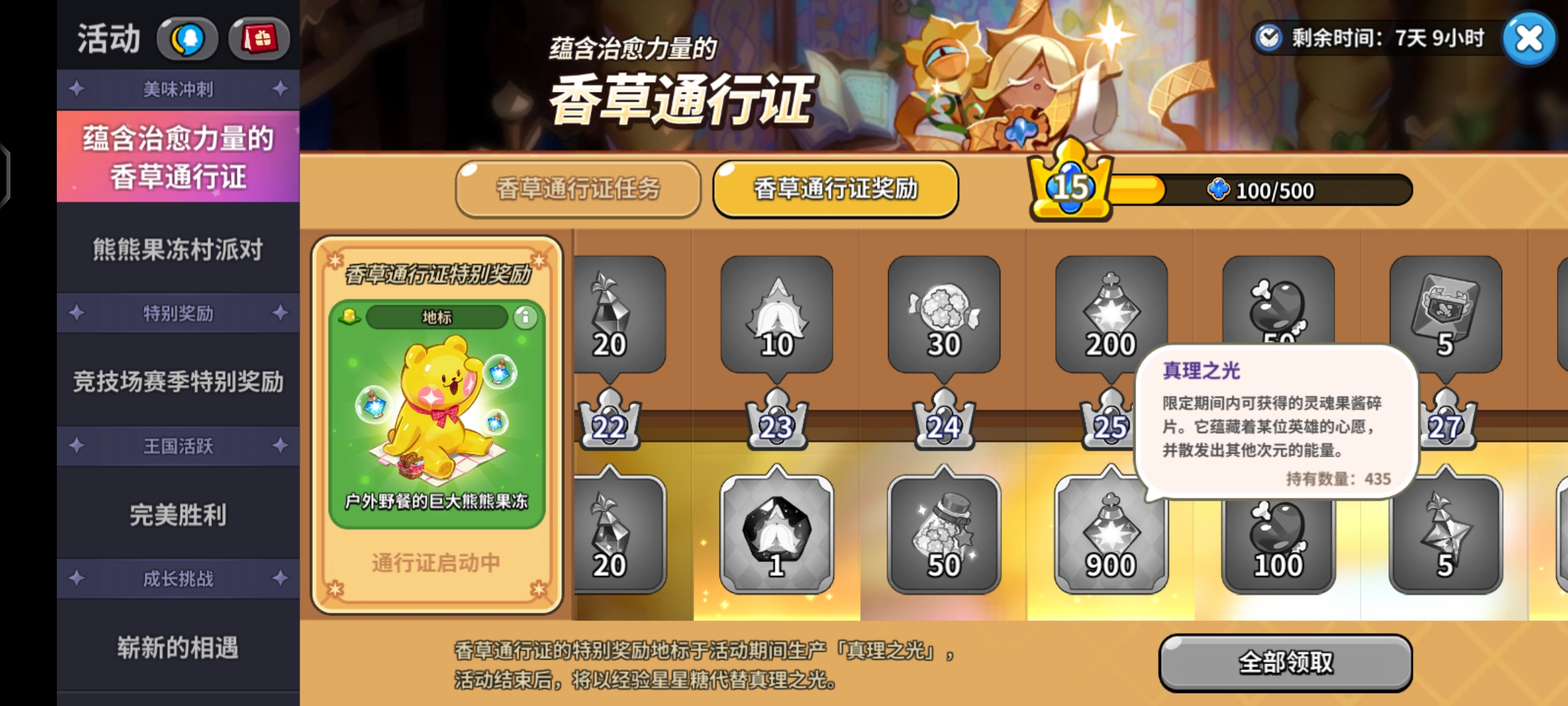 按照我的進度算上剩的一點香草活動加上25級香草通行證送的真理之光第七天一個保底綽綽有余。如果你和我一樣要硬吃保底,我建議你把通行證送的五十積分都領完再抽保底出來,因為香草池子結束之后香草積分也會清零。