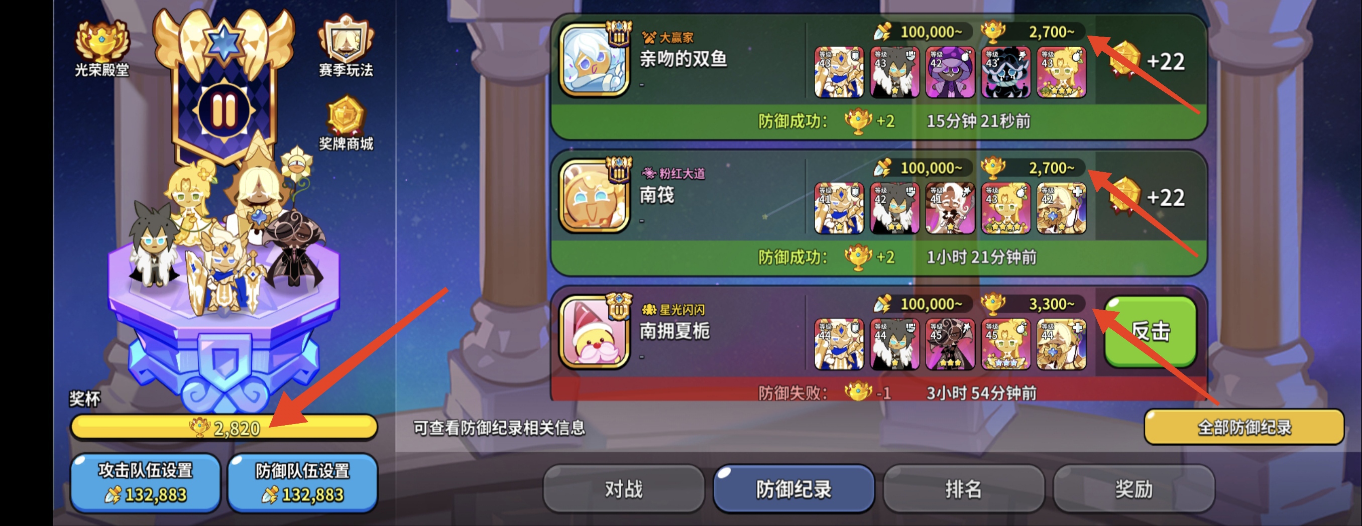 ②防守陣容可以隱藏餅干的時(shí)候,記得隱藏關(guān)鍵信息。比如隱藏后排單餅干、隱藏低星輸出餅干、隱藏不常見(jiàn)餅干,盡量誤導(dǎo)其他人高估你的戰(zhàn)力/錯(cuò)估你的玩法??梢员M量少被打、少掉杯。