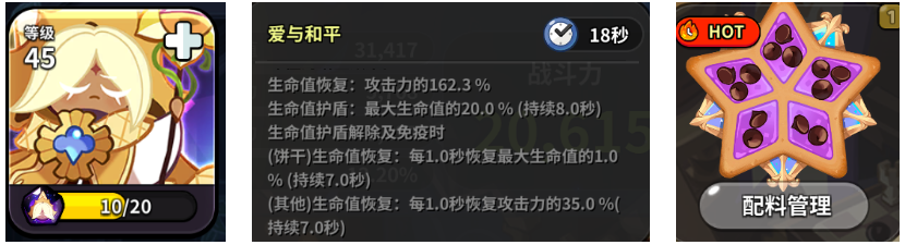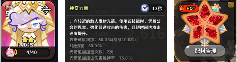 給我方生命值最低的2個(gè)餅干套上持續(xù)10秒的40%減傷,可以很好的保護(hù)我方中后排餅干,提升整個(gè)隊(duì)伍的生存環(huán)境,版本新貴。